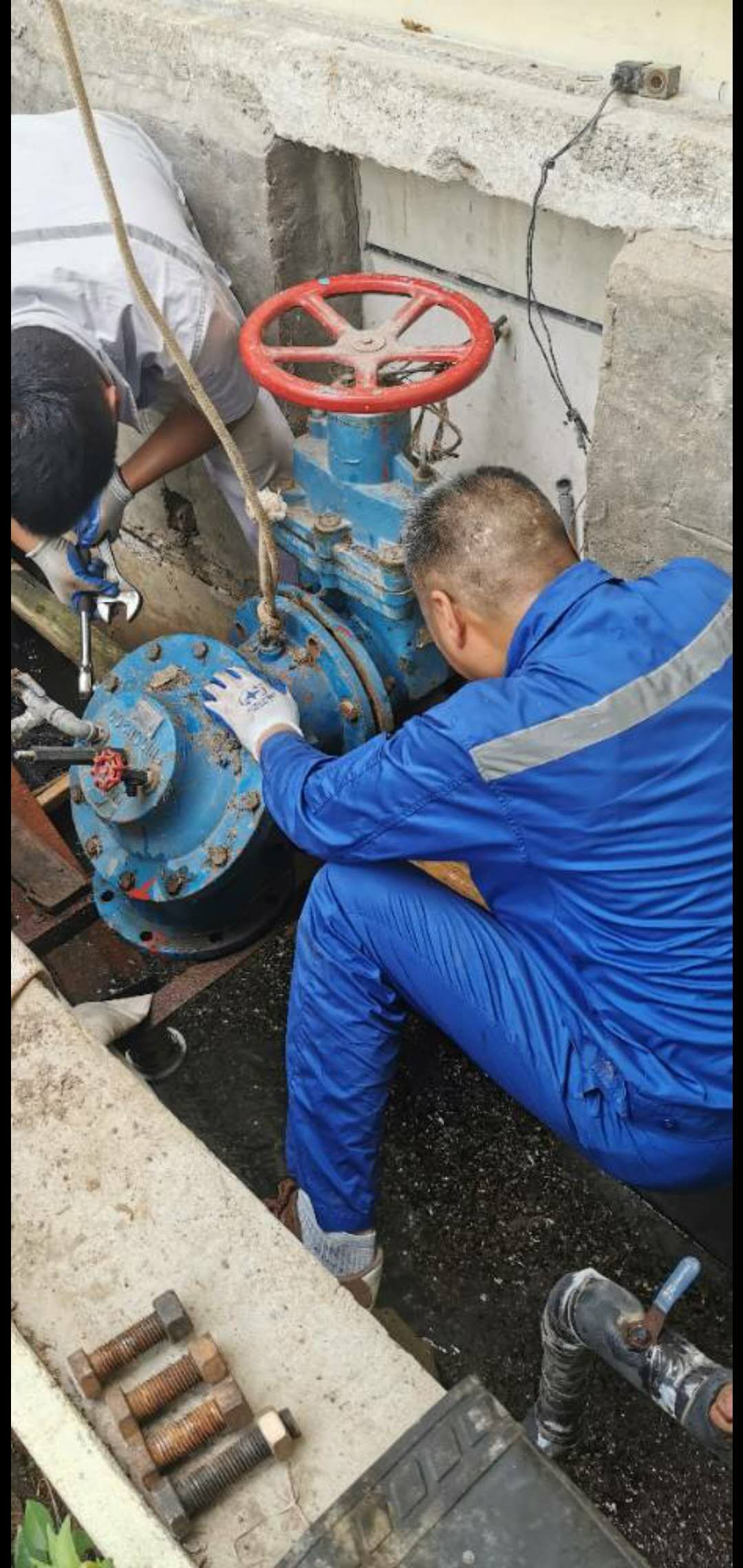 7月20日,接制水部反饋,一水廠4萬噸沉淀池出現排泥不暢情況。因為排泥直接影響到沉淀水的水質,所以機電部立即響應,組織相關人員開始研究方案,組織維修。 因為閥門為DN200口徑,口徑過大,無法使用消防水進行反沖洗。經領導和維修人員研究后,緊急切割一塊DN200的悶板,在當中切割出一個圓孔,再將消防水袋的外絲接口焊接上去,接上高壓水槍就可以進行沖洗了。說完就干,從悶板的切割,再到焊接拼裝,緊緊用了2個小時就完成了。再進行降溫測試后,立即趕往現場進行沖洗。